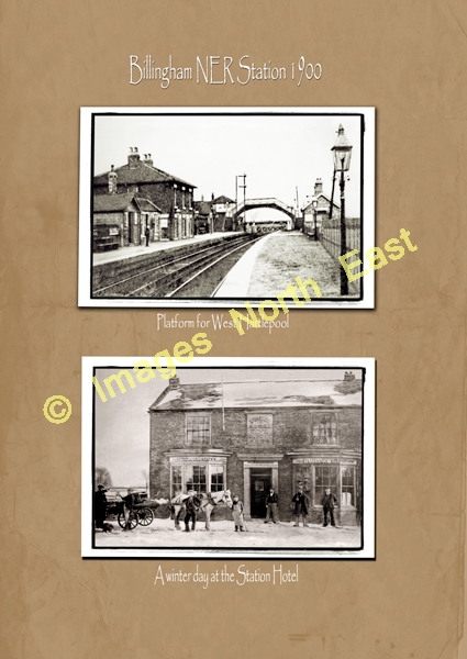 This 'Duo-Print' shows Billingham Station and the Station Hotel which stood adjacent to the level-crossing. A hostelry on this site dates back to the 1830's when the railway at Billingham was first constructed. Initially known as The Union Inn, it was extended and renamed The Station Hotel in the 1860's - coinciding with the opening of the new station buildings at Billingham. This building is shown here - this in turn was extended to become the present building in the 1930's. A Bass House, the name of the landlord, John Pitchford, can be clearly seen above the door. The open fields behind hint at the rural location of the Hotel at that time.