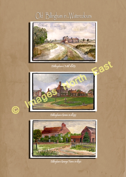 Old Billingham is the subject of three watercolours which are included in this print. Taken as prints from the original works, the images show Billingham Watermill, Billingham Green and Billingham Grange farmhouse c1900. The lands belonging to Billingham Grange were to be swallowed up by the Synthetic Ammonia & Nitrates Ltd factory although the old farmhouse survived until the 1980's. The watermill also became a casualty of the industrial development, being demolished in the 1930s.